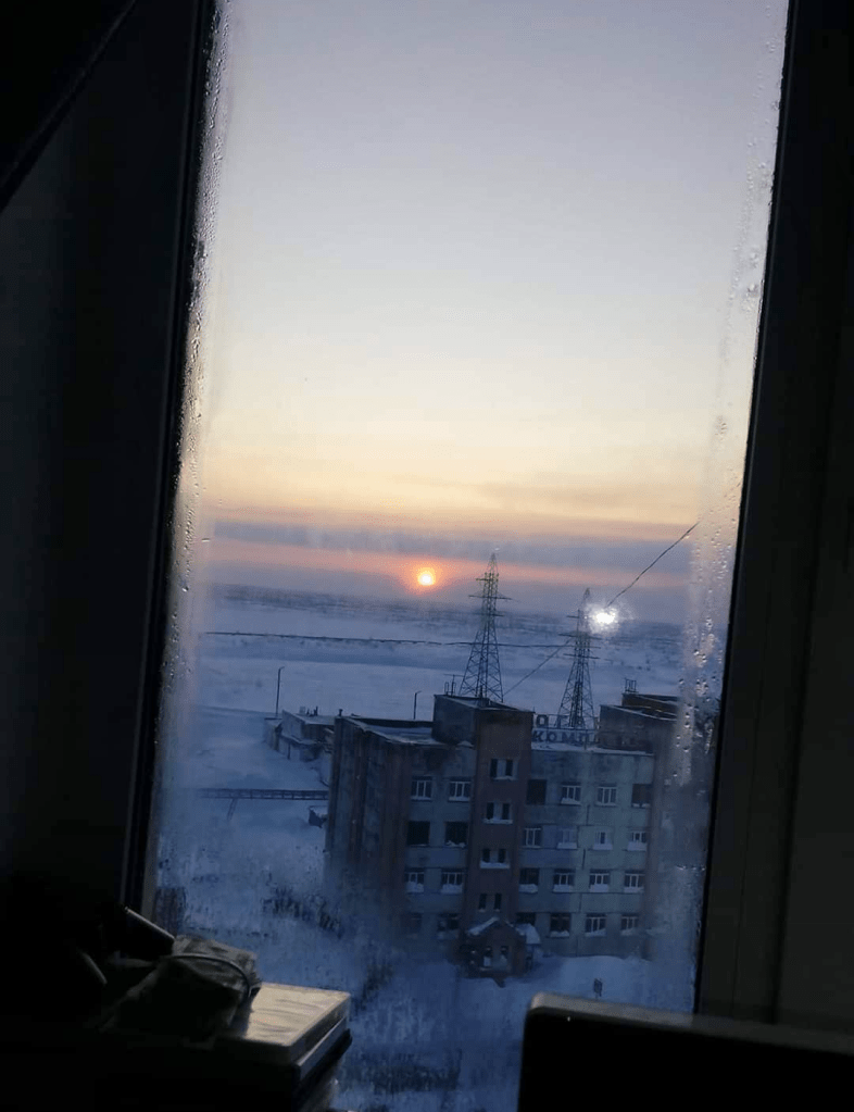 Our story opens on December 4 in Norilsk, Siberia, in the Russian Federation. Several days earlier, the sun had risen and set for the last time for the next six weeks. At the moment our heroine, Roza, was in an orange grove, with bees buzzing near her head. Of course, Roza had never been in an orange grove or seen a bee, but such is the magic of dreams. The bees continued buzzing loudly until Roza awoke to realize that she had forgotten to turn off her alarm. That remedied, she slept for 2 more hours.